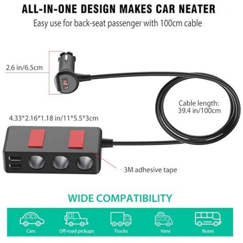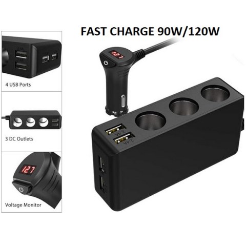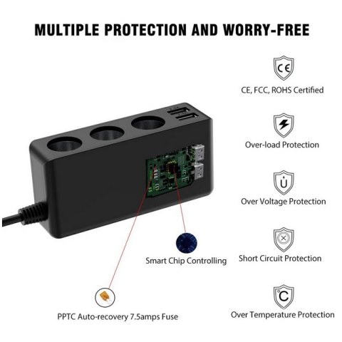 120W 3-Way Cigarette Lighter Adapter, 4-Port USB Car Charger with Intelligent IC Technology, Built-in 7A PPCT fuse and 10A car fuse, On/off switch with LED voltage indicator |