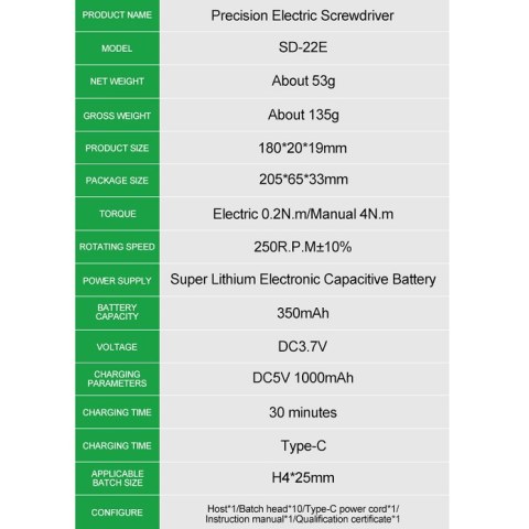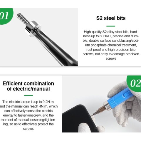 Μύτες από κράμα χάλυβα S2 υψηλής ποιότητας, σκληρότητα έως 60HRC, ακριβής και ανθεκτική, διπλή επιφάνεια αμμοβολής/νατρίου, χημική επεξεργασία φωσφορικών, βίδες ανθεκτικές στη σκουριά και υψηλής ακρίβειας, βίδες ακριβείας που δεν καταστρέφονται εύκολα. Η ηλεκτρική ροπή είναι έως 0,2N.m και η χειροκίνητη μπορεί να φτάσει τα 4N.m, η οποία μπορεί να ανιχνεύσει αποτελεσματικά την ηλεκτρική ενέργεια για στερέωση/ξεβίδωμα και τη στιγμή χειροκίνητης χαλάρωσης/σφίξιμο, έτσι ώστε να προστατεύονται αποτελεσματικά οι βίδες.