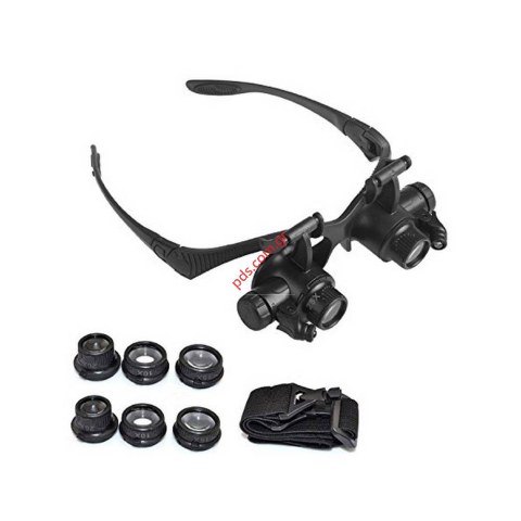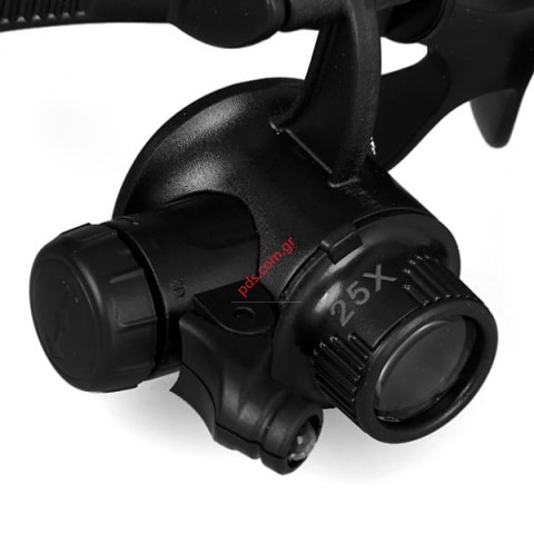 Γυαλιά μεγεθυντικός φακός με δυνατότητα zoom 25x και με LED φωτισμό για να βλέπετε ακόμα και στο σκοτάδι. Ο φωτισμός ενεργοποιείτε από τους διακόπτες που υπάρχουν στο πλάι των φακών. Κατασκευασμένα από ανθεκτικό πλαστικό υψηλής ποιότητας και επενδυμένα με μαλακή σιλικόνη σας προσφέρουν άνεση και αποφυγή τραυματισμού όσες ώρες κι αν τα φορέσετε. Μπορείτε να τα χρησιμοποιήσετε για μικρο-επισκευές μηχανικές ή ηλεκτρονικές, για τον έλεγχο γνησιότητας κοσμημάτων και αντικών, για την επισκευή ρολογιών ακόμα και την χάραξη αντικειμένων. Διαθέτει ρυθμιζόμενους βραχίονες πάνω από τους φακούς έτσι ώστε να προσαρμόζονται ανάλογα με την οπτική γωνία που επιθυμείτε, όπως επίσης και ελαστική κορδέλα 38 εκατοστών για να μην υπάρχει ο κίνδυνος να πέσουν τα γυαλιά ενώ κάνετε την εργασία σας.