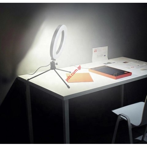 Φωτιστικό δαχτυλίδι LED με διάμετρο 16cm, ιδανικό για λήψη φωτογραφιών ή βίντεο, μακιγιάζ και live μεταδόσεις. Διαθέτει λαμπτήρα που προσφέρει τη δυνατότητα αλλαγής χρώματος λευκού φωτός (ψυχρό, θερμό, ουδέτερο) αλλά και την μείωση/αύξηση της φωτεινότητας. Επιπλέον, στην συσκευασία συμπεριλαμβάνεται μίνι επιτραπέζιος τρίποδας.