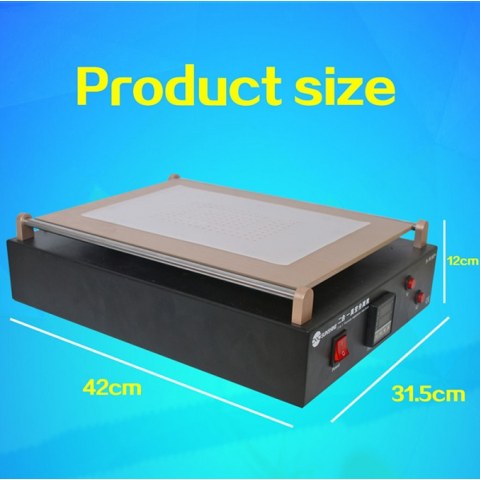 Preheater machine Power 250W , weight 8.3kg, size hotplate 42x31.5cm, Indoor temperature is 26 degree, this modelseparator rising to 100 degree only needs 3 minutes.